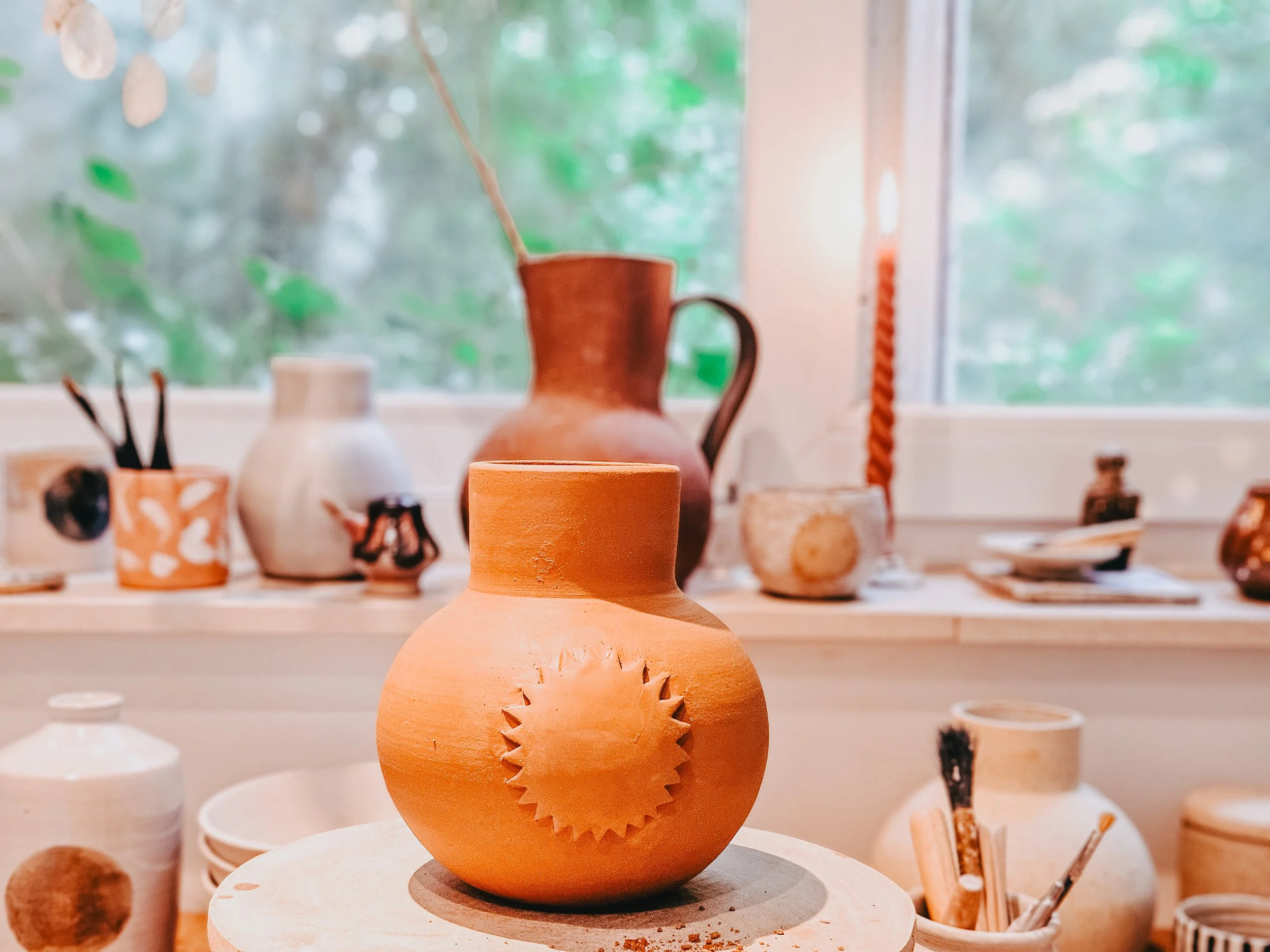 Je travaille dans mon atelier, chez moi, à Forest, Bruxelles. Je crée chaque pièce en grès sur le tour de potier ou en modelage. J'aime revisiter des formes traditionnelles,